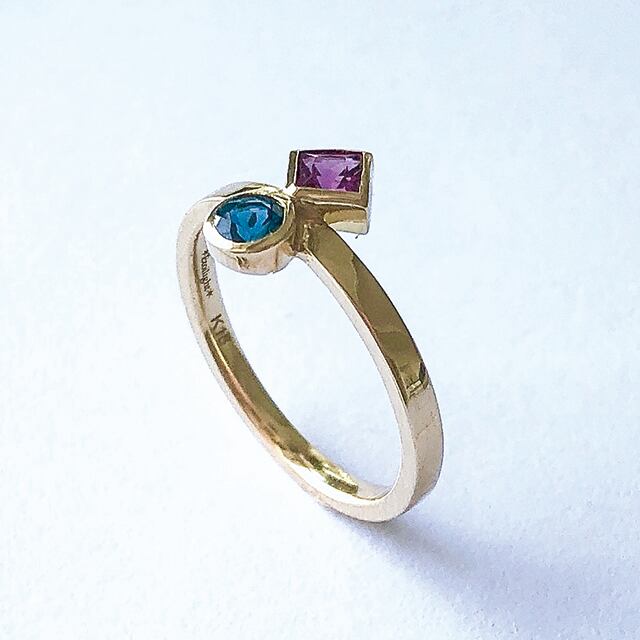 スクエアにカットされたロードライトガーネットとブリリアントカットのロンドンブルートパーズのコンビネーションが個性的でありながらも大人シックなリングです。